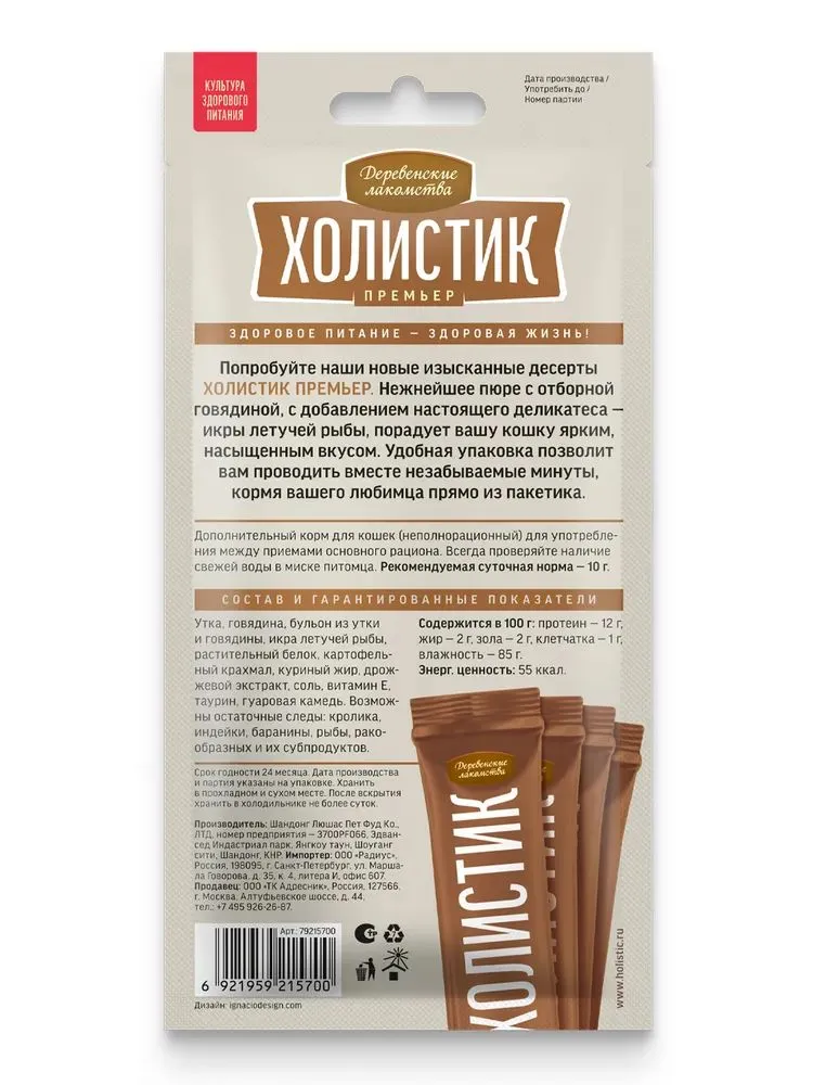 Здоровье и долголетие являются основными приоритетами в рецептурах продуктов «Холистик Премьер». Именно поэтому основой для наших рецептов является организация сбалансированного питания домашних животных. Изысканный десерт Холистик Премьер, нежнейшее пюре со вкусом говядины с добавлением настоящего деликатеса - икры летучей рыбы. Яркий насыщенный вкус точно понравится вашей кошке, а удобная упаковка позволит вам проводить вместе незабываемые минуты. *Дополнительный корм для кошек (неполнорационный) для употребления между приемами основного рациона. Товар сертифицирован.