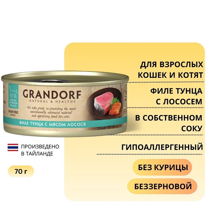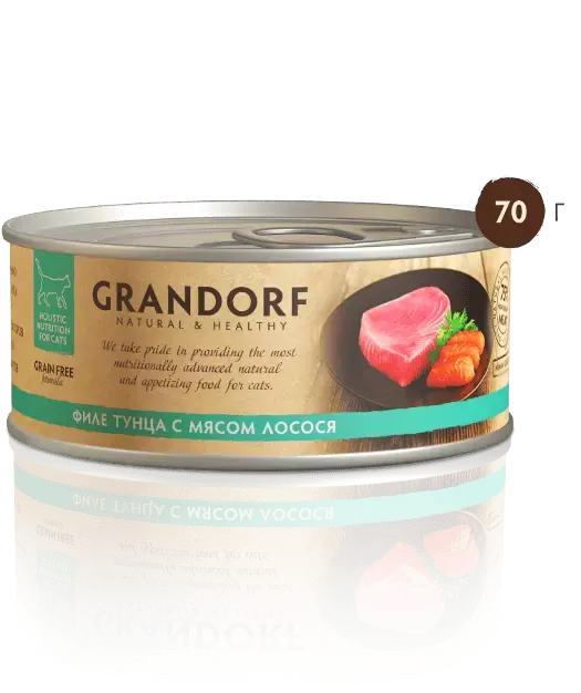 75% мяса в составе (50% филе тунца, 25% филе лосося) и 0% зерновых