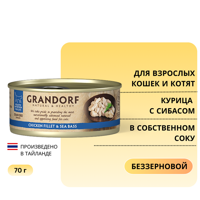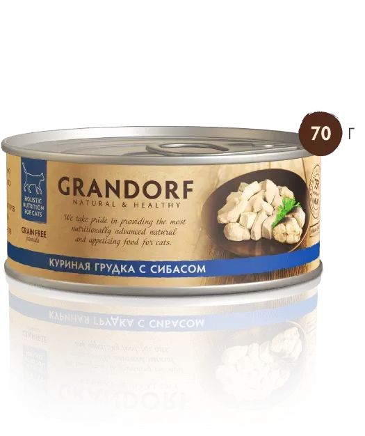 75% мяса в составе (50 куриная грудка, 25% филе сибаса) и 0% зерновых!