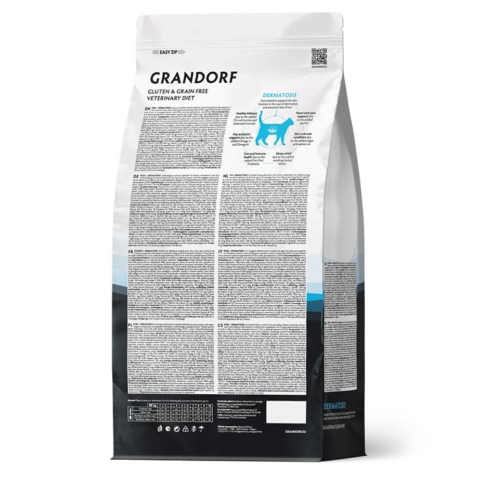 Полнорационный диетический корм для кошек, предназначенный для поддержания защитных функций кожи при дерматозах и чрезмерном выпадении шерсти.