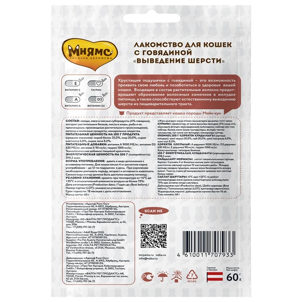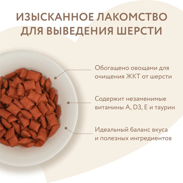 Хрустящие подушечки с начинкой фирмы Мнямс - это изысканное и полезное угощение, от которого не откажется даже самая привередливая и избалованная кошка. Входящий в состав солод и овсяные волокна предотвращают образование волосяных комков в желудке животного, помогают естественно выводить шерсть из пищеварительного тракта.