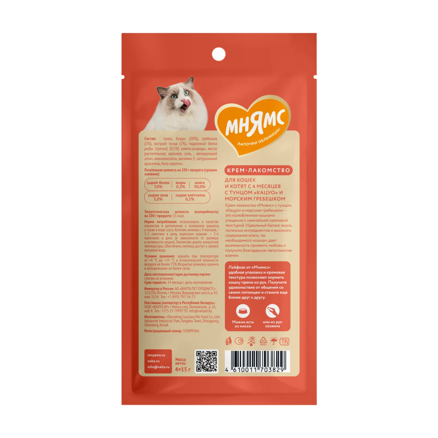 тунец Кацуо (20%), гребешок (5%), экстракт тунца (1%), гидролизат белка рыбы (треска) 0,5%, олигосахариды, масло растительное, крахмал, соль, желирующий агент, аминокислоты, витамин Е, натуральный краситель, бета-каротин.